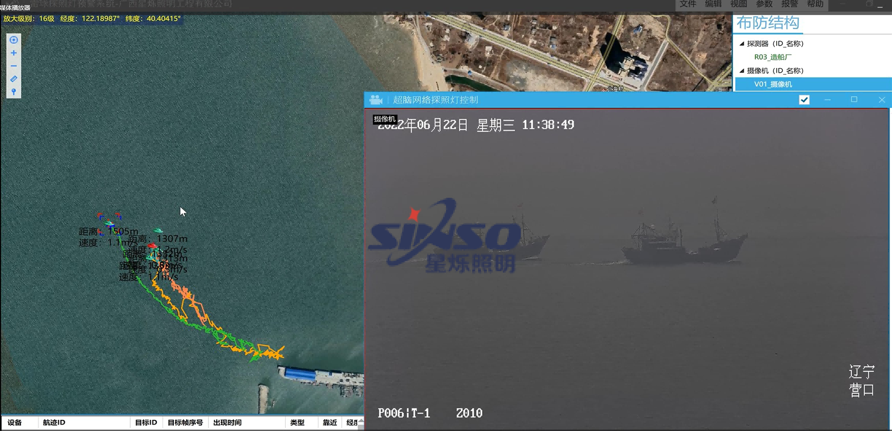 近海漁政監(jiān)管信息系統(tǒng)的GIS地圖,可以一鍵定位,在地圖上點擊任意位置,攝像機和探照燈自動的轉到該位置。當雷達發(fā)現目標,發(fā)出報警,并精準地報出目標所在方位和距離,攝像機和超腦網絡探照燈根據雷達反饋的目標位置立即自動的轉動并鎖定跟蹤目標,攝像機自動調整到適合焦距,確?;貍鞯膶崟r畫面中的目標清晰可見,直到人工解除跟蹤;同時支持北斗衛(wèi)星導航,AIS,提供的當地區(qū)域船舶的定位信息,對比匹配目標船舶信息,能更好的管理船舶進出港口。