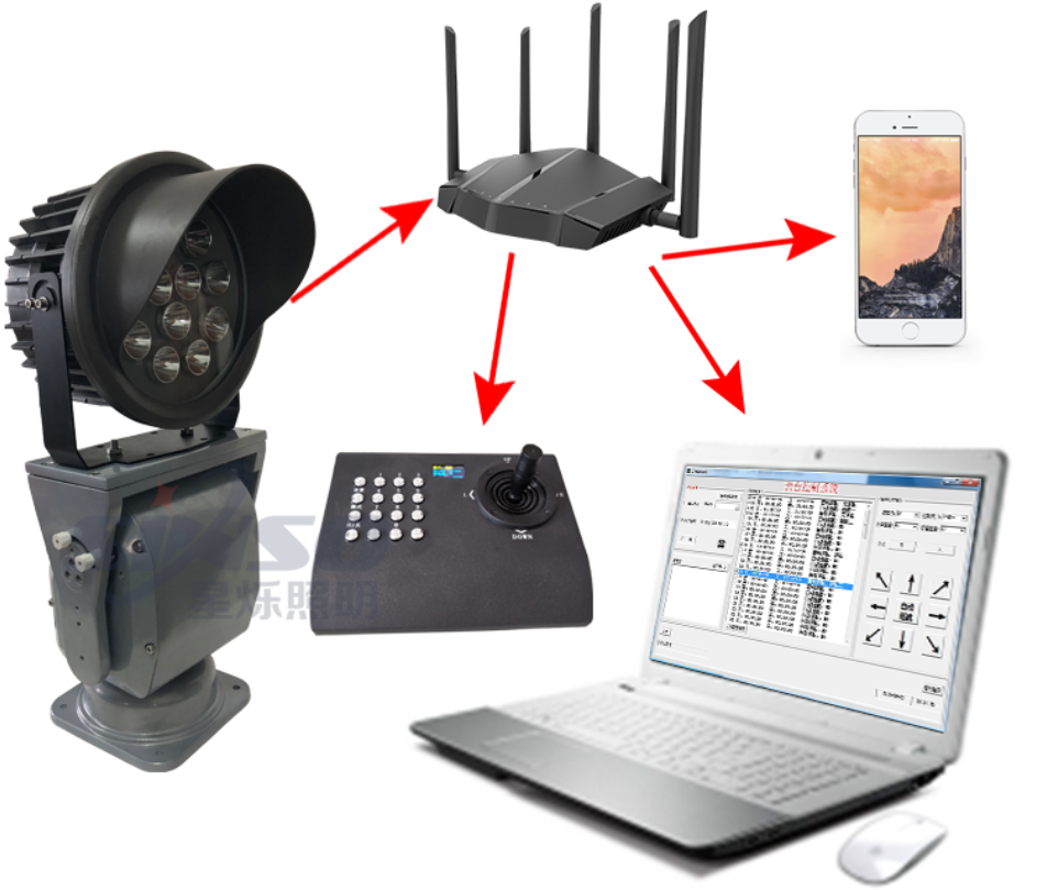 隨著不斷的研發(fā)改良,星爍照明現(xiàn)推出聯(lián)網(wǎng)探照燈,可通過IP/TCP協(xié)議控制,可接入外網(wǎng)或局域網(wǎng)。聯(lián)網(wǎng)探照燈可實(shí)現(xiàn)多項(xiàng)控制,可網(wǎng)絡(luò)智能鍵盤控制、電腦控制軟件控制、手機(jī)控制。隨后又推出WIFI款探照燈,無需再布置信號線或者網(wǎng)線,通過WiFi連接控制。