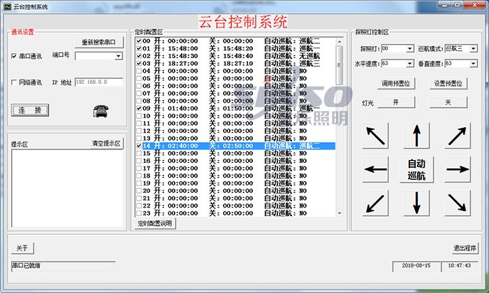 通過我們的控制軟件,可以實(shí)現(xiàn)八個(gè)方向的調(diào)節(jié),探照燈三種巡航模式:水平巡航、垂直巡航、水平+垂直巡航,旋轉(zhuǎn)速度調(diào)節(jié),可以實(shí)現(xiàn)定時(shí)功能,99組定時(shí)開關(guān)設(shè)置,可設(shè)置燈具開啟/關(guān)閉時(shí)間、工作狀態(tài);也可以實(shí)現(xiàn)預(yù)置位功能,設(shè)置和調(diào)用預(yù)置位。