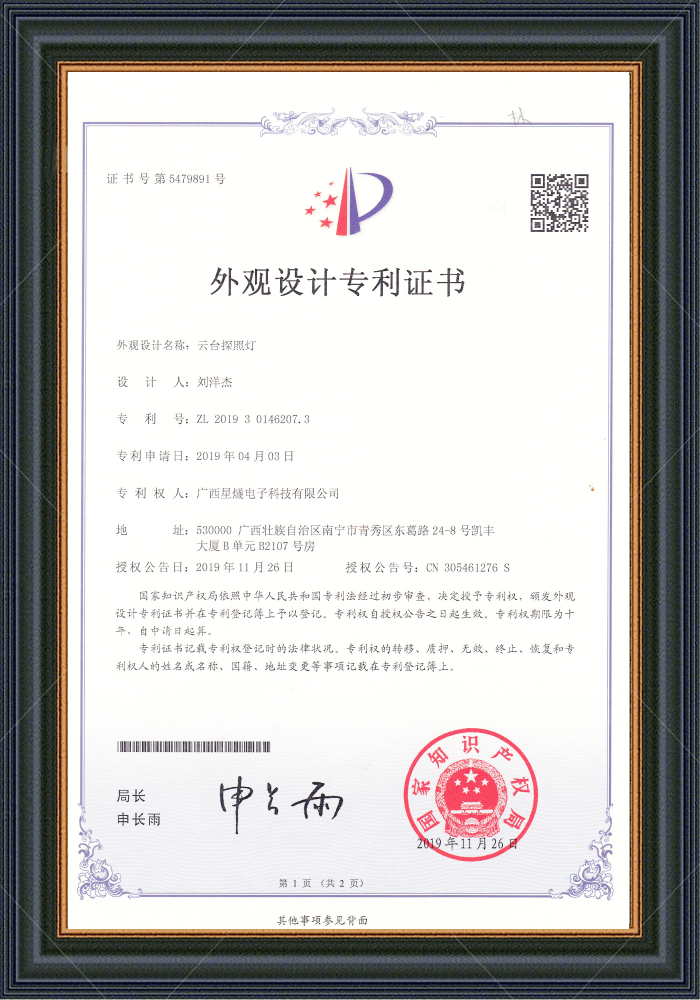 云臺(tái)探照燈 專利號(hào):ZL201930146207.3
