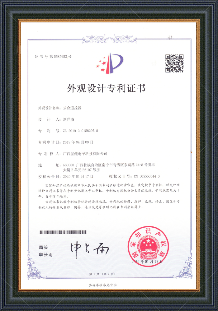 云臺(tái)遙控器 專利號(hào): ZL 2019 3 0158297.8