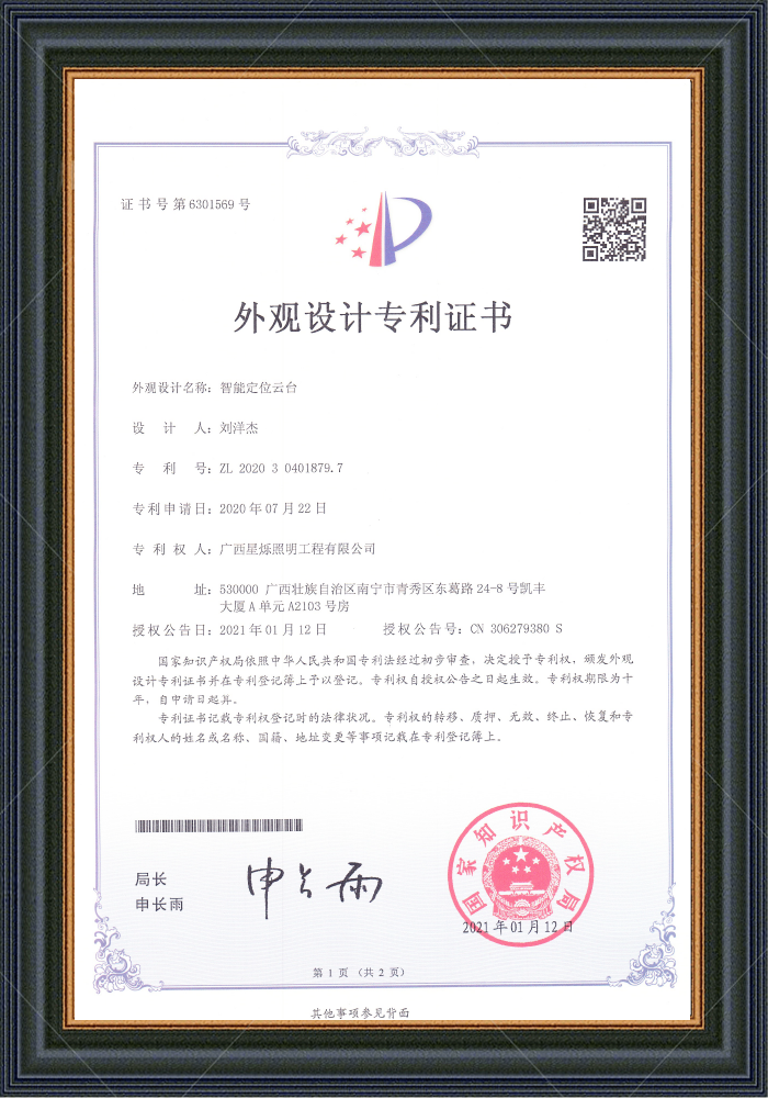 智能定位云臺(tái) 專利號(hào): ZL 2020 3 0401879.7