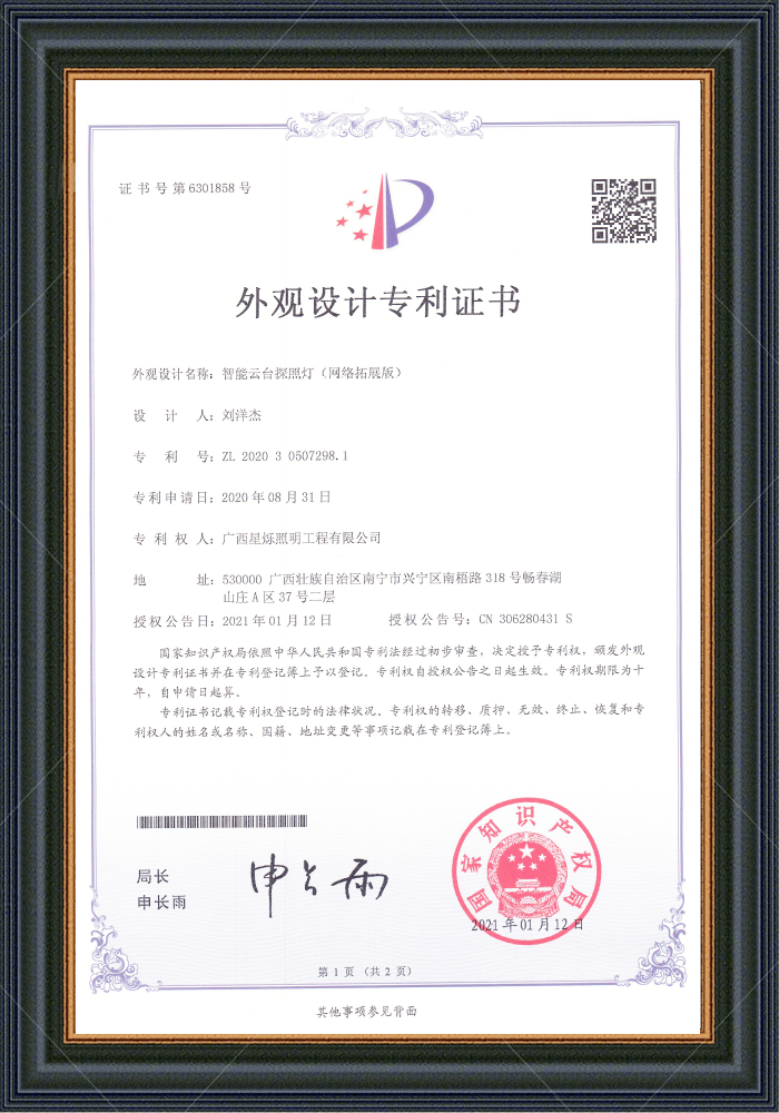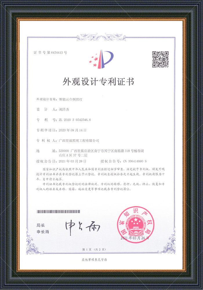 智能云臺(tái)探照燈 專利號(hào):ZL202030542546.6